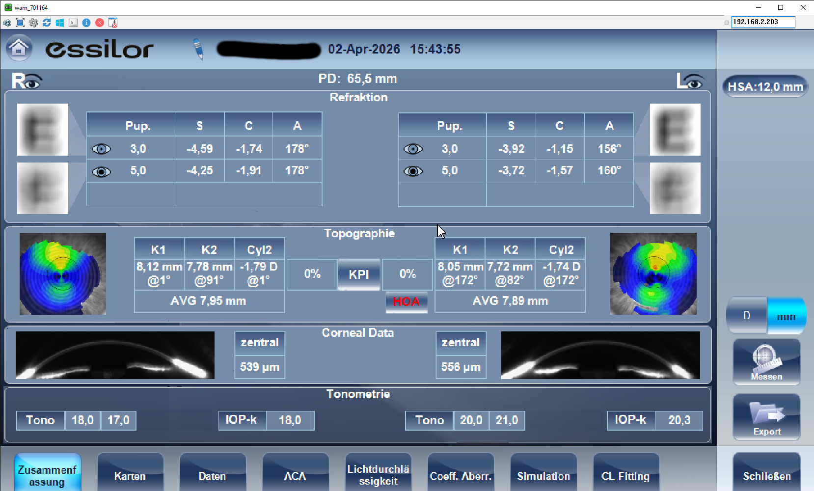 Visus R cc 1,1 Lcc 1,1 Vbi. 1,20 IOPkorr R: 18 mmhg L: 20,3 mmhg ( keine Therapie des IOP)
