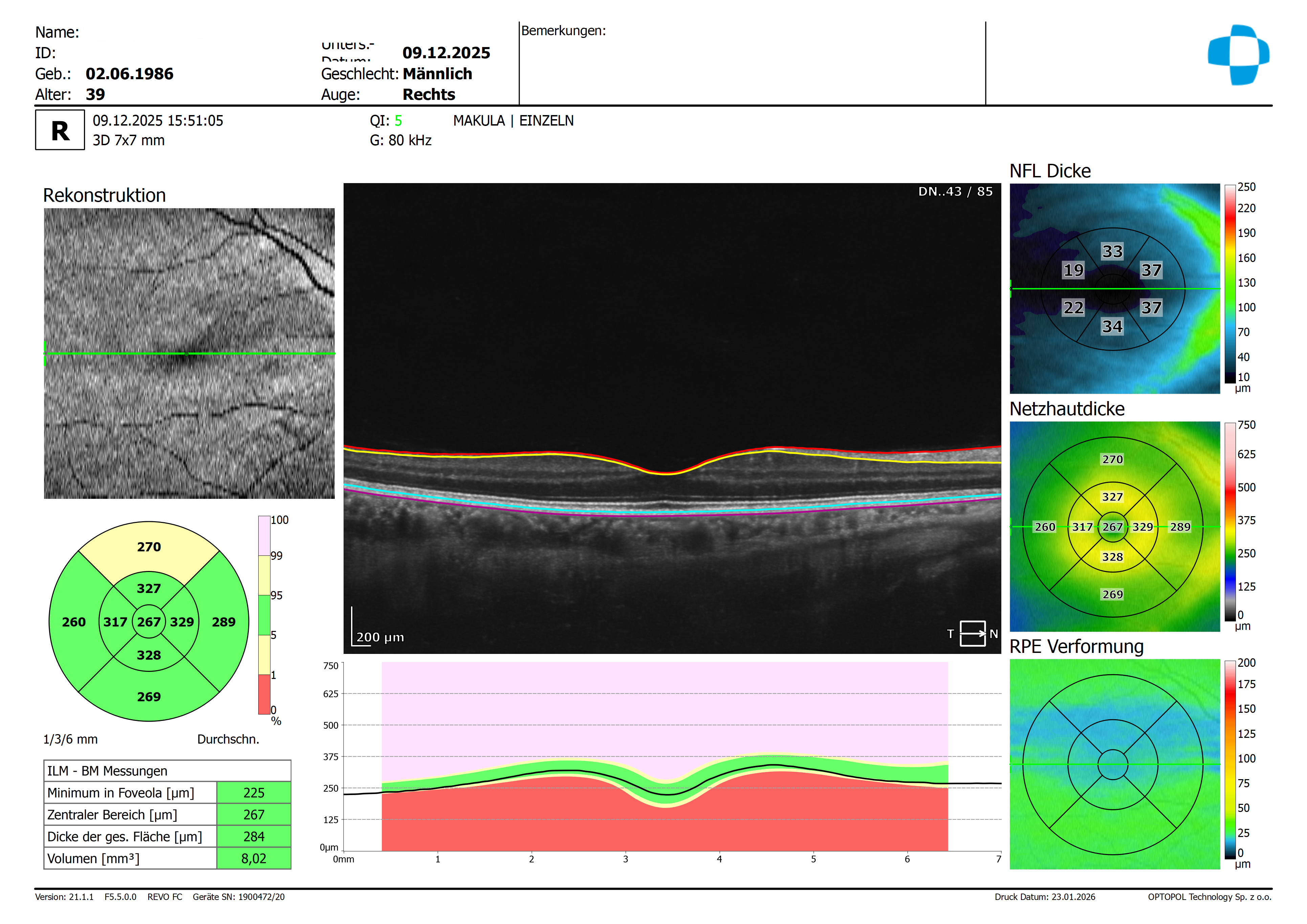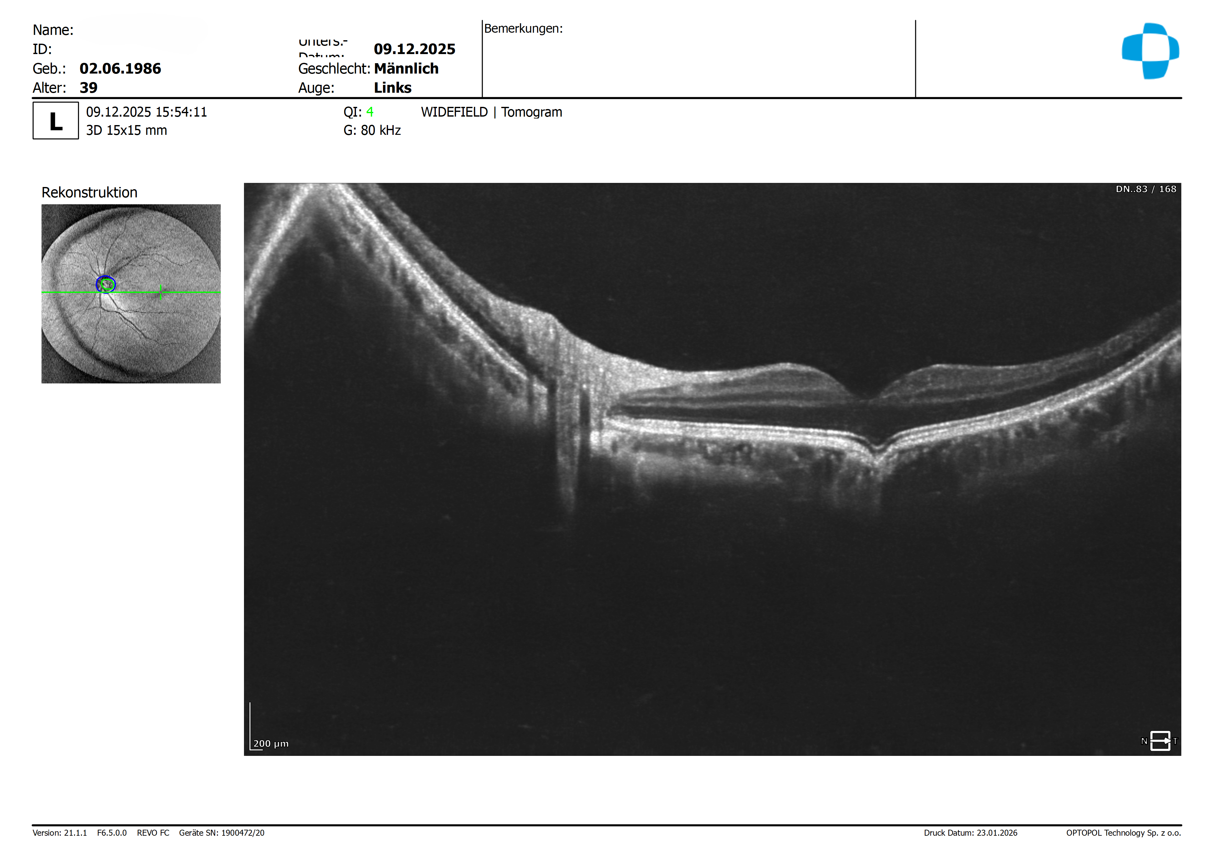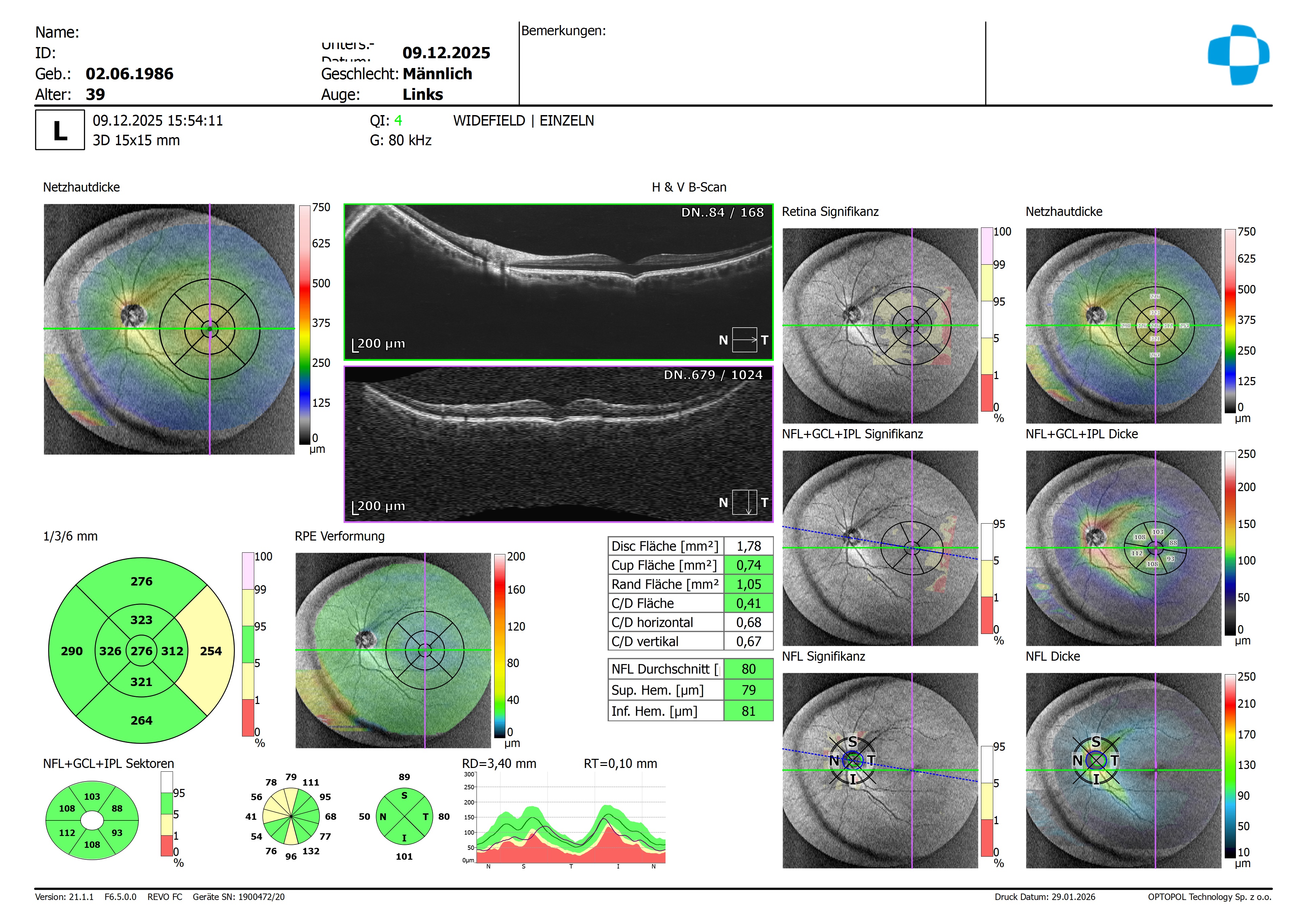 Wie bei einer mittleren Myopie üblich haben wir in der Perepherie der NFL eine Dickenreduktion, welche ich jedoch auf Grund der Formänderung des Bulbus als normal einstufen würde.