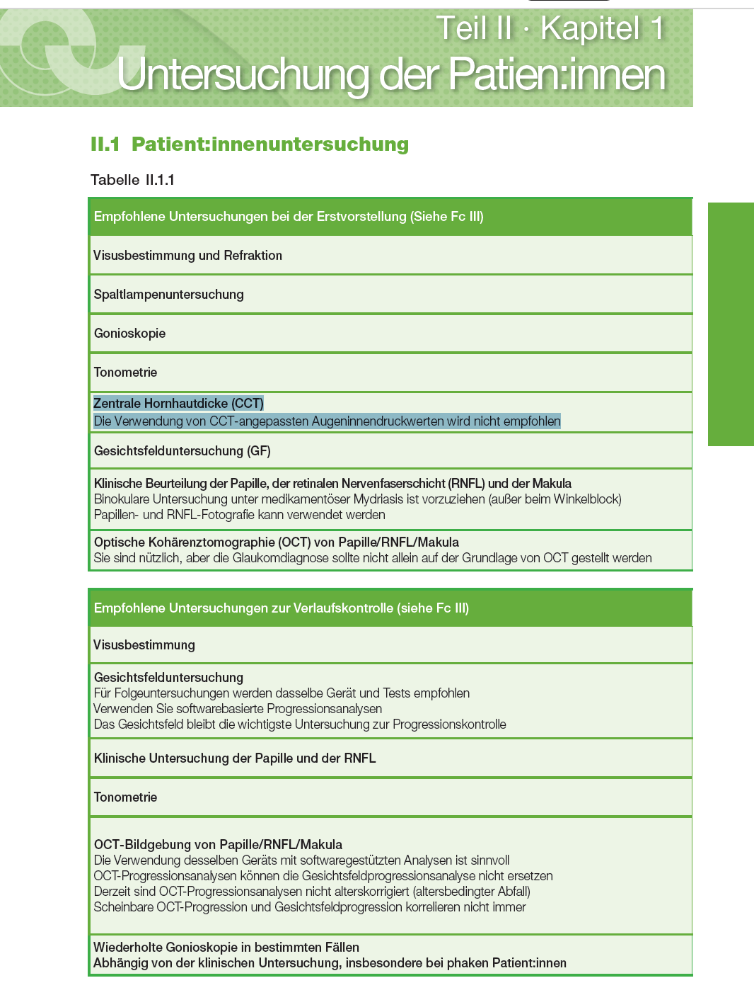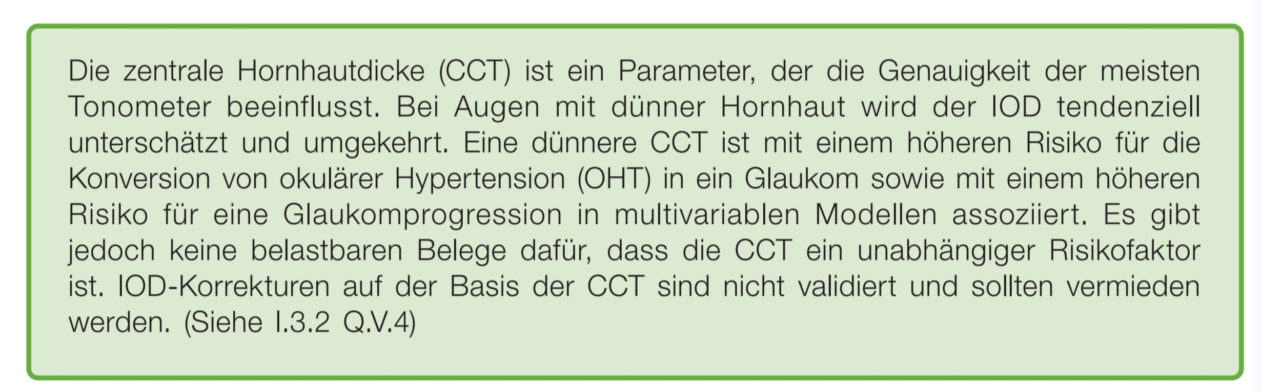 Als maßgebliche Referenz für die Glaukomdiagnostik gelten weiterhin die Leitlinien der European Glaucoma Society (EGS), wie auch in den dargestellten Slides aufgeführt. Diese Leitlinien haben ihre Bewertung der zentralen Hornhautdicke (Central Corneal Thickness, CCT) in den letzten Jahren angepasst: Die CCT soll nicht mehr isoliert oder korrigierend zur Augeninnendruckmessung herangezogen werden, jedoch weiterhin in die individuelle Risikoeinschätzung des Patienten einfließen (siehe entsprechende Abbildung).