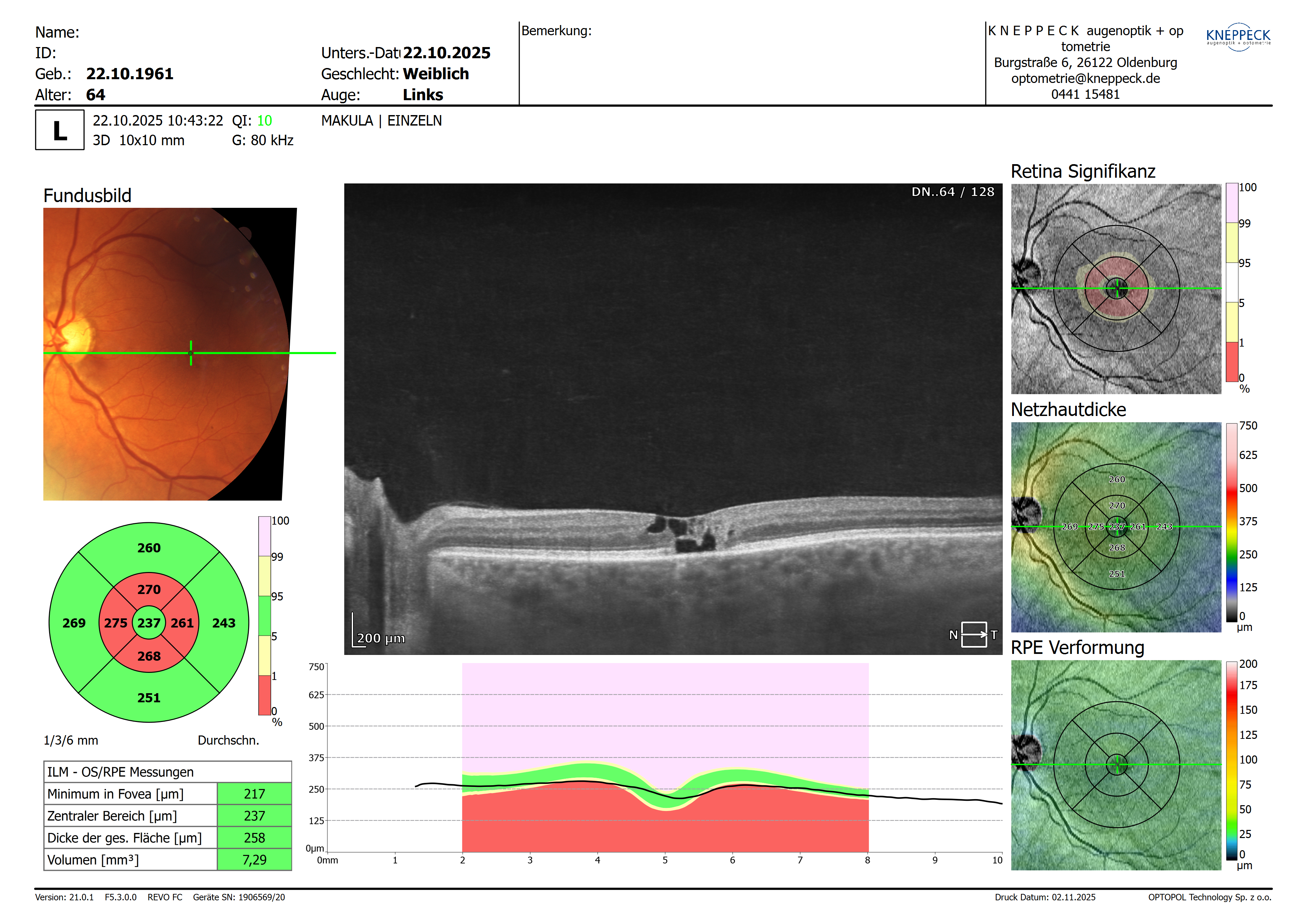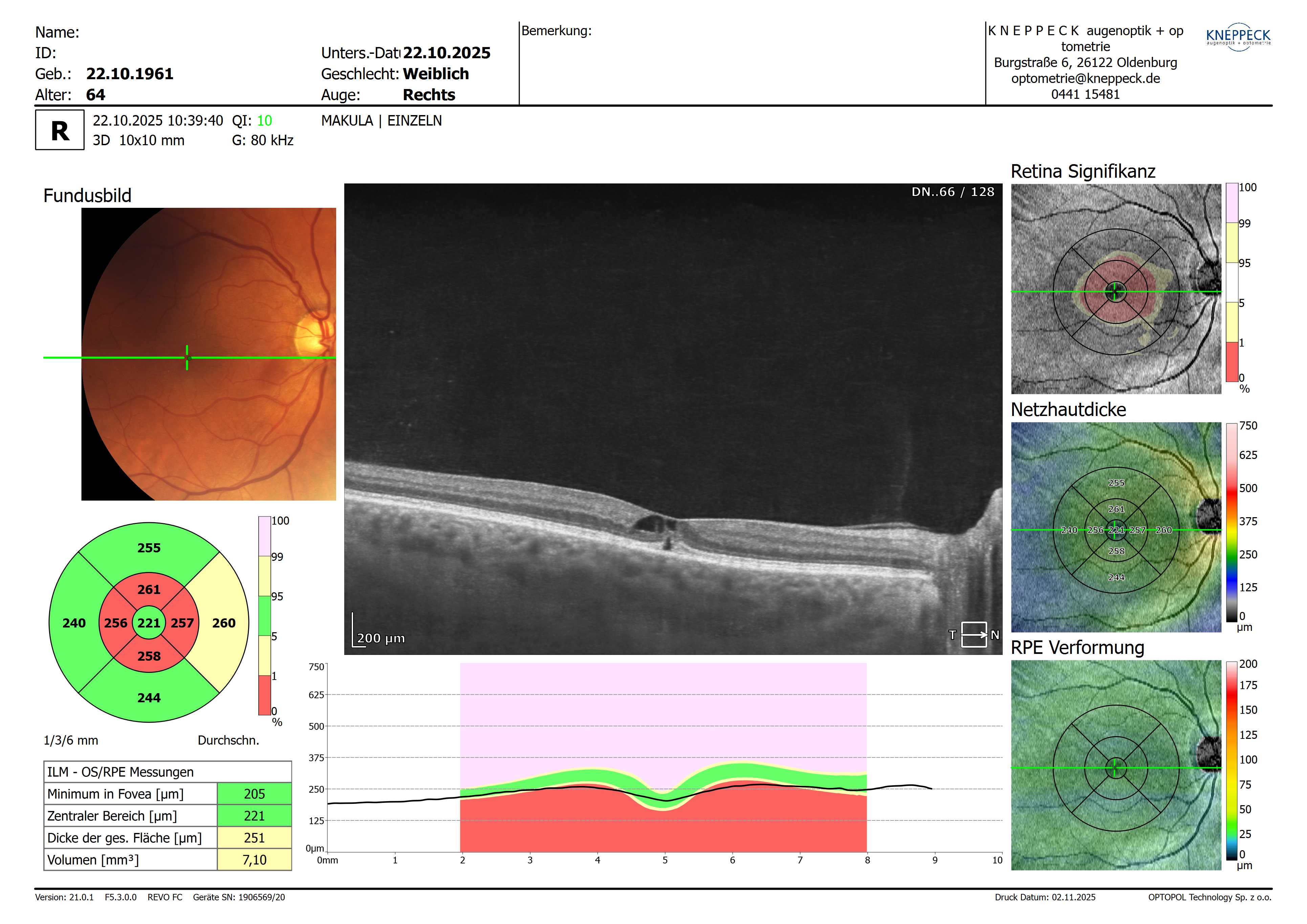 CDR rechts: 0,6-0,7 „Makula: aufgelockert, Verbeiterung der fovealen Senke, keine frische Blutung, NH anliegend“ CDR links: 0,5 „Makula: aufgelockert, fleckförmiges Aussehen der Fovea, keine frische Blutung, NH anliegend…. In der optischen Kohärenztomographie imponieren an beiden Augen die vorbeschriebenen intraretinalen Kavernen mit Gewebebrücken ohne Anhalt für eine Progression im OCT-Vergleich….“