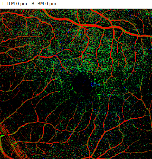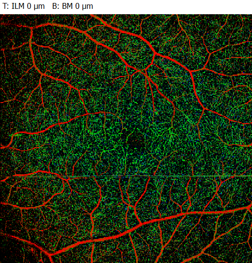 In Ihrem Bildvergleich erkennt man sehr schön die typischen Veränderungen des Kapillarplexus im Vergleich zu einer gesunden Netzhaut. Besonders betroffen ist hier der tiefe kapilläre Plexus (Deep Capillary Plexus, DCP).