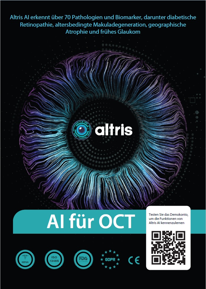 Altris AI hebt die Interpretation von OCT-Aufnahmen auf ein neues Niveau. Die KI analysiert retinale Strukturen automatisiert, erkennt und quantifiziert pathologische Veränderungen und liefert objektive, reproduzierbare Ergebnisse in Sekundenschnelle. Für Augenoptiker und Optometristen bedeutet das eine deutlich höhere diagnostische Sicherheit sowie eine wertvolle Unterstützung bei der Früherkennung selbst subtiler Auffälligkeiten. Die Technologie fungiert als intelligente Zweitmeinung, reduziert das Risiko übersehener Befunde und stärkt die klinische Entscheidungsfindung – gerade im zunehmend anspruchsvollen Vorsorge- und Screeningbereich.